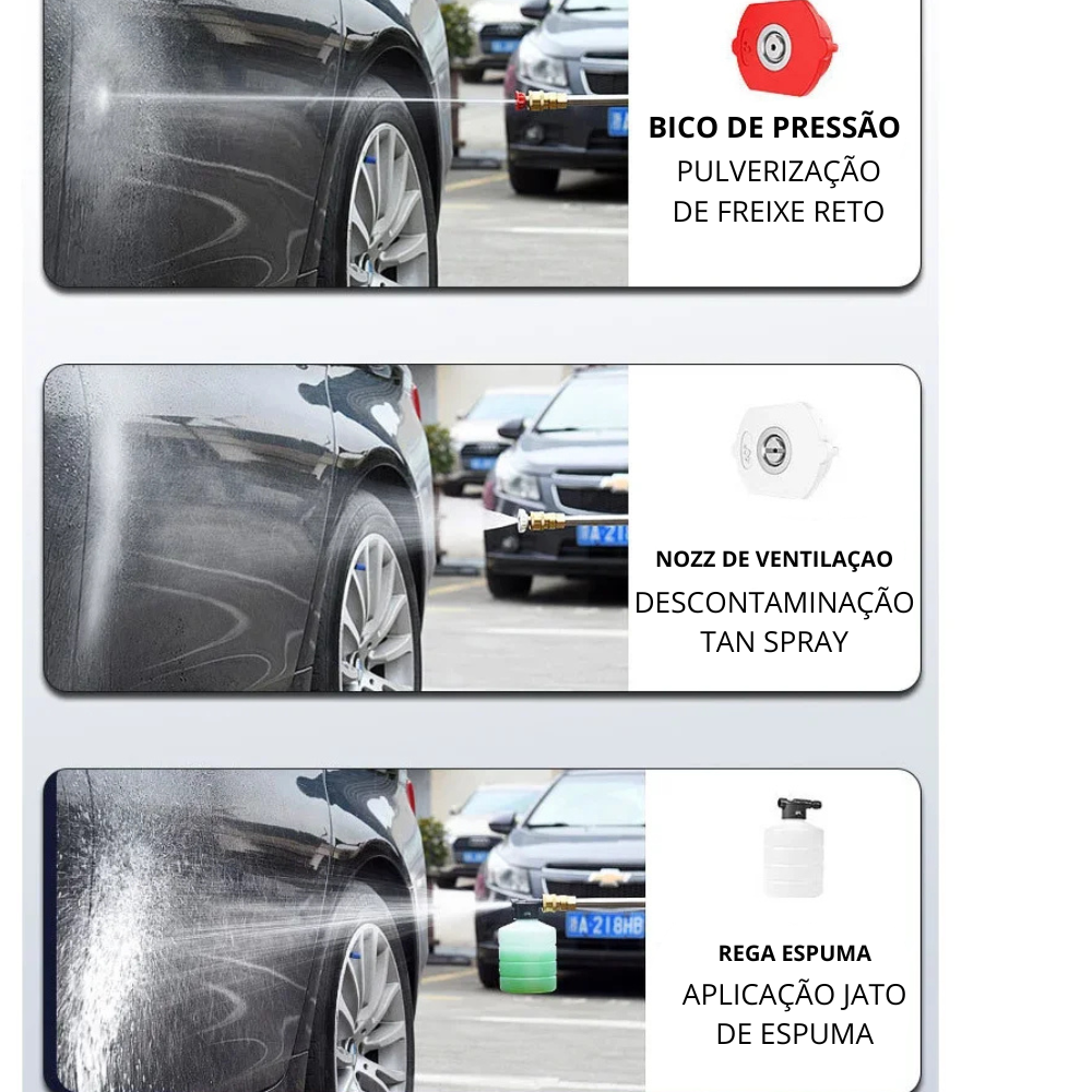 - Multiuso: Além de carros, a Mini Lavadora Power pode ser usada para limpar motos, bicicletas, calçadas, móveis de jardim e muito mais!
