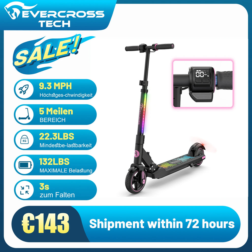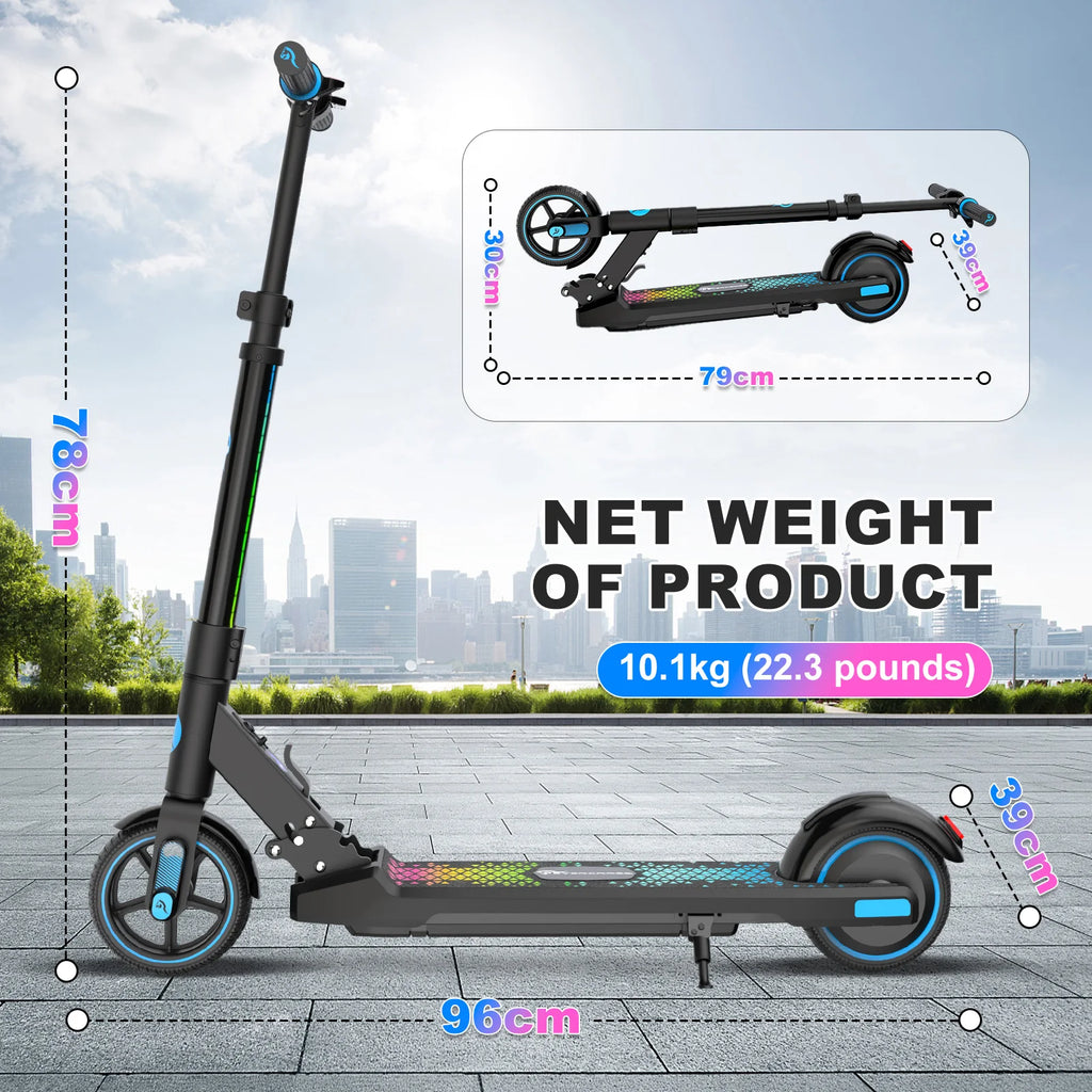 With colorful LED lights on the rod and elegant neon lights, the scooter is not only attractive, but also very visible in the dark. Electric brake ensures optimal security for young drivers.
